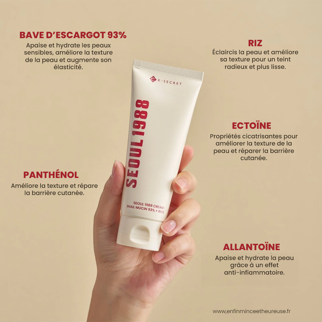 La crème Seoul 1988 réunit le meilleur du soin coréen avec des ingrédients reconnus comme :
